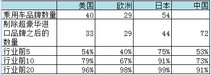 注:1、美國、歐洲、日本數據均為2018年,中國數據為2019年10月;2、國內乘用車品牌數計算:一汽大眾和上汽大眾均算作大眾品牌;3、美國區域僅包含轎車;歐洲數據來自于歐盟和歐洲自由聯盟協會成員國數據之和;日本統計范圍為普通乘用車,不包含小型乘用車。