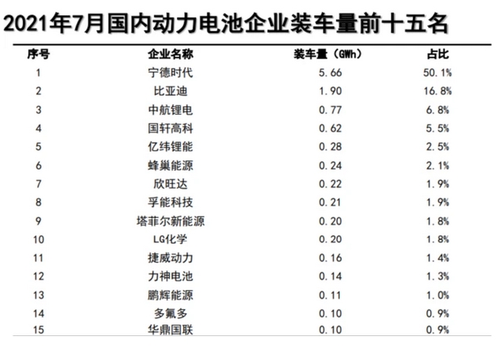 根據8月11日中國汽車動力電池產業創新聯盟的數據顯示,7月份國內動力電池企業裝車量前五名分別為:寧德時代(50.1%)、比亞迪(16.8%)、中航鋰電(6.8%)、國軒高科(5.5%)、億緯鋰能(2.5%)。