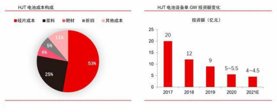 隨著PECVD設備國產化和“銀包銅”技術電極優化方案的應用,HIT成本仍有望進一步降低。現階段,異質結單吉瓦設備投資成本已從2019年的8-10億元,降低至2020年的5億元,2021年有望降低至4億元左右。