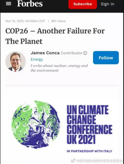 11月12日,《福布斯》網站發表署名James Conca的文章,題目是:COP26–Another Failure For The Planet(COP26——地球的又一次失敗)。