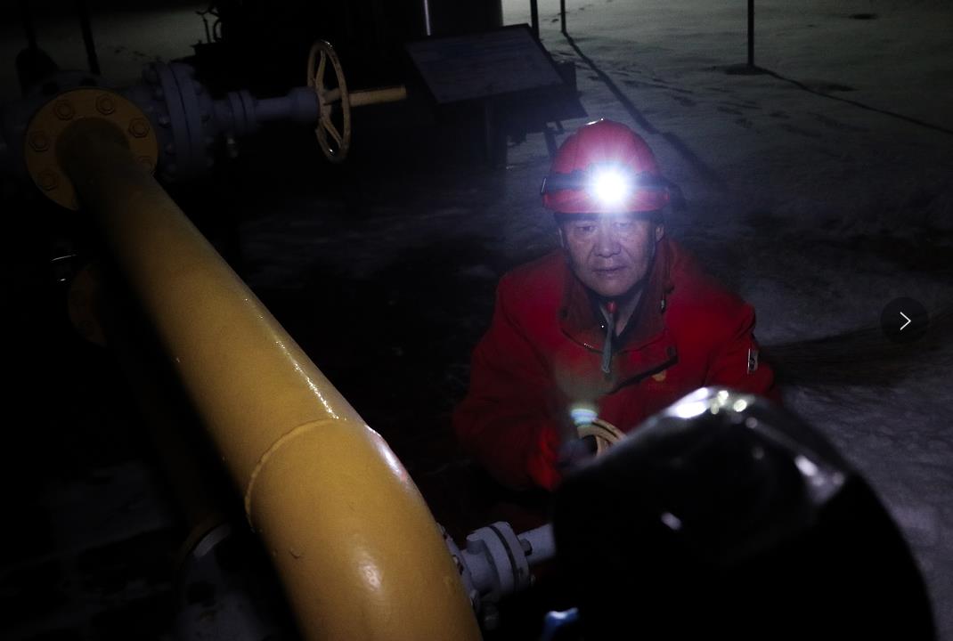 圖為:1月25日晚采油四廠廊東采油作業區員工宋建輝查看氣井壓力,確保該井雨雪天氣過后油氣平穩生產。(宋常青 錢瑋瑋)