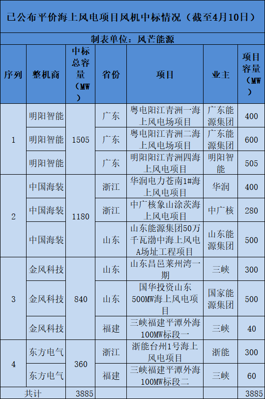 風芒能源根據(jù)公開信息不完全統(tǒng)計,截至目前,已有3.885GW平價海上風電機組中標。其中,拿標超1GW的有明陽智能、中國海裝2家整機商。明陽智能拿標最多,都集中在廣東地區(qū)。