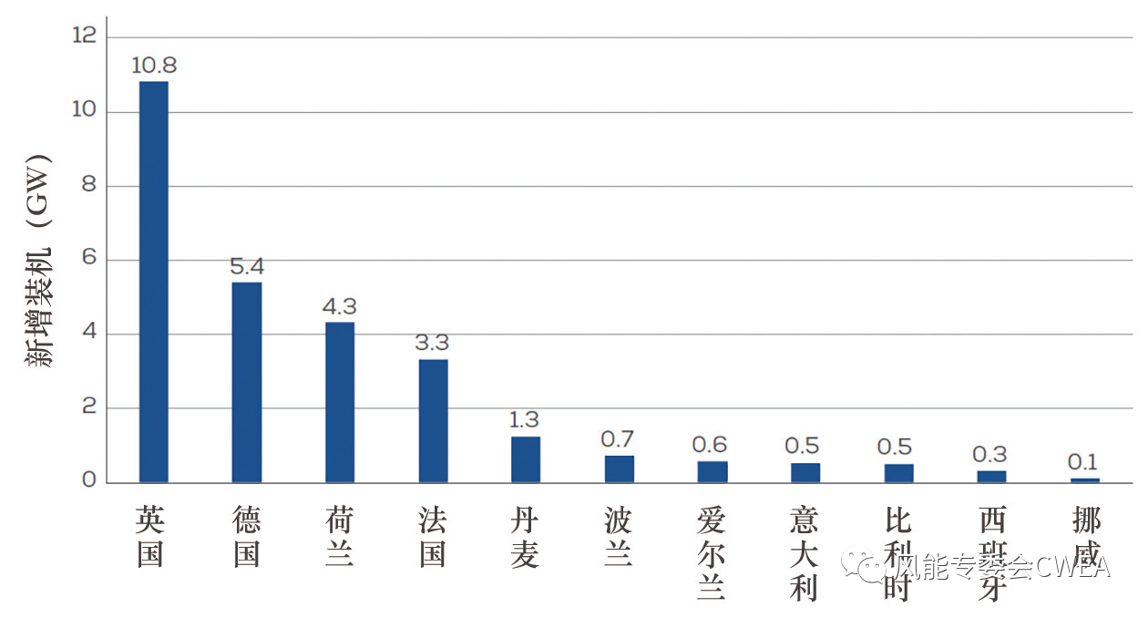 2021年,歐洲海上風電新增裝機3.4GW。在各國中,英國的新增裝機容量最多,正是得益于安裝了2317MW海上風電機組,占總裝機容量的88%。另外3個實現海上風電新增裝機的國家為荷蘭、丹麥、挪威,分別新增裝機392MW、605MW、4MW。