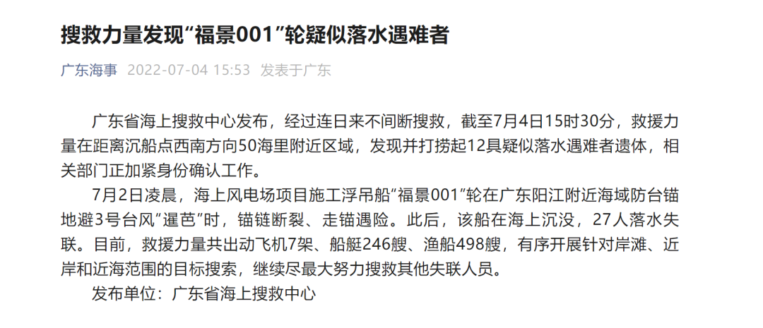 截至7月4日15時30分,搜救力量找到12具遇難者遺體,另外救起一名幸存者,尚有14名船員失聯。
