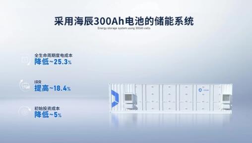 高工儲能獲悉,對比280Ah電池,采用海辰300Ah電池的儲能系統,可以實現全生命周期度電成本降低~25.3%;在用戶側儲能電站、一天一充應用場景下,可實現IRR提高18.4%;前三年儲能系統總放電量增加~5%,從而減少電量超配,實現初始投資節省~5%。