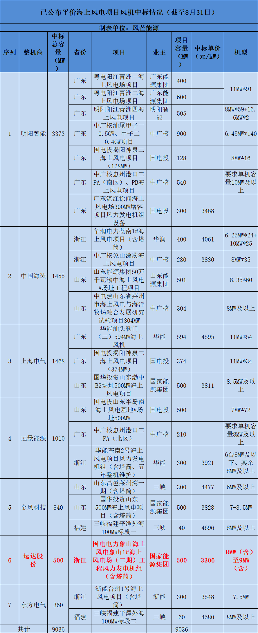根據公開信息不完全統計,該項目為運達股份在國內中標的首個海上風電項目。