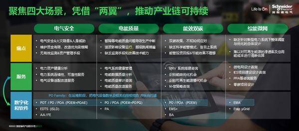“四大場(chǎng)景”即“電氣安全、電能質(zhì)量、能效雙碳、綜能微網(wǎng)”。施耐德電氣數(shù)字能源服務(wù)部總經(jīng)理?xiàng)钇奖硎荆┠偷码姎庠诜?wù)領(lǐng)域有四大目標(biāo)市場(chǎng),即建筑、工業(yè)、基礎(chǔ)設(shè)施和數(shù)據(jù)中心,而電氣安全、電能質(zhì)量、能效雙碳、綜能微網(wǎng)四大場(chǎng)景是支撐這四大目標(biāo)客群可持續(xù)發(fā)展和數(shù)字化低碳轉(zhuǎn)型的關(guān)鍵支柱或者關(guān)鍵場(chǎng)景。