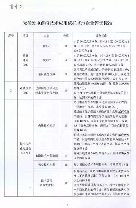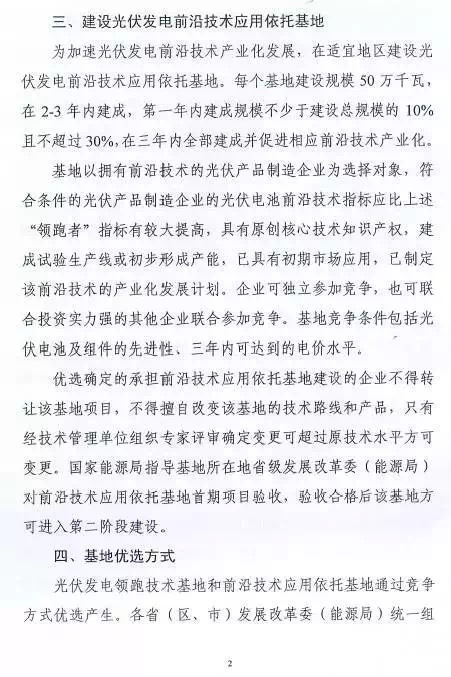 相比此前業(yè)界盛傳的“領跑者升級版”計劃,通知提出的“光伏發(fā)電前沿技術應用依托基地”明顯縮水,每個基地建設規(guī)模確定為500M瓦(此前傳說每個基地至少1GW),基地在2-3年內建成,第一年內建成規(guī)模不少于建設總規(guī)模的10%且不超過30%,在三年內全部建成并促進相應前沿技術產業(yè)化。