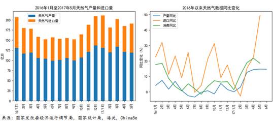同一天發(fā)布的《中國(guó)能源網(wǎng)能源行業(yè)研究報(bào)告•2017年第二季》顯示,受經(jīng)濟(jì)好轉(zhuǎn)、煤改氣政策、點(diǎn)供快速發(fā)展等因素影響,2017年以來(lái),天然氣產(chǎn)量、消費(fèi)量、進(jìn)口量同比均有大幅攀升,前5月對(duì)外依存度略高于2016年,超過(guò)35%。